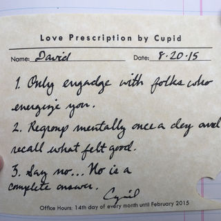 I began doing love prescriptions because every time I say my given name – Cupid – the majority of folks ask me for love advice. This inspired me to embody “Cupid” as a character who resembles a 20th century therapist like Sigmund Freud. As a method of this character, I use Freud’s technique of “free association” to encourage a participant to talk freely about any aspect of their love life. In return I write a “love prescription” based on our conversation on die cut hearts with India ink. This prescription can take many forms, including an insight the participant has unknowingly revealed to me or a task that the participant should do based on what they have told me. This performance was done on the 14th day of each month in 2014-2015 and has been performed upon request. This performance has been a way for me to own my identity as Cupid and share the wonderful unexpected moments of intimacy in conversations between strangers about Love.